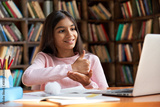 Smiling indian latin deaf disabled child school girl learning online class on laptop communicating with teacher by video conference call using sign language showing hand gesture during virtual lesson.
