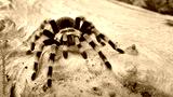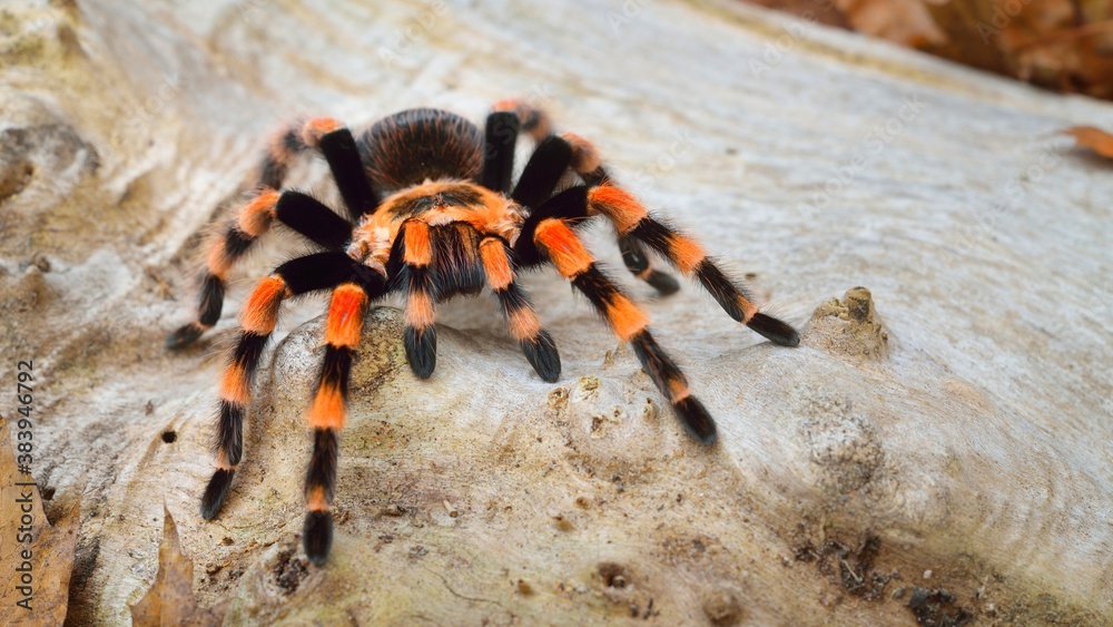 Birdeater tarantula spider Brachypelma smithi in natural forest environment. Bright orange colourful giant arachnid.