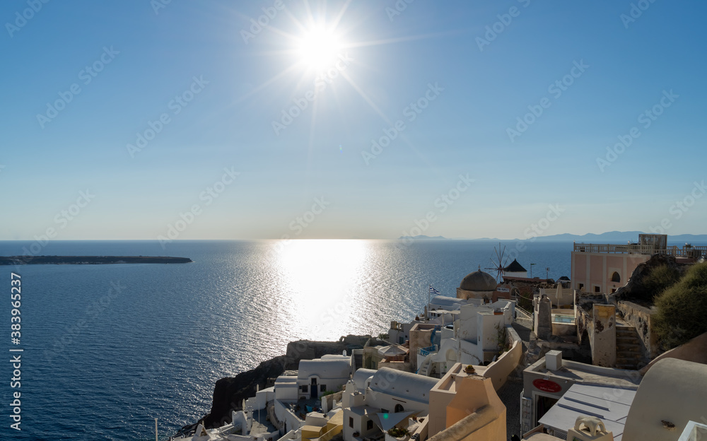 Panoramic view of Oia town in Santorini island with old whitewashed houses and traditional windmill, Greece. Greek landscape on a sunny day