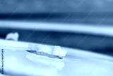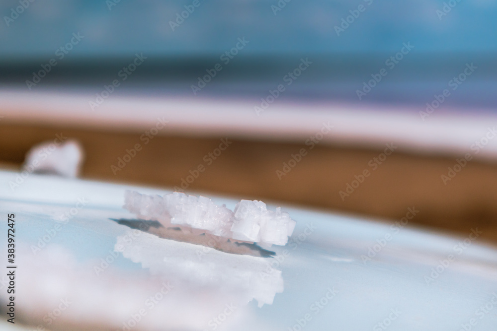 Pink white salt flake crystal formation on white reflective surface with blurred pink salty lake landscape background. Spa resort sunny color graded close-up