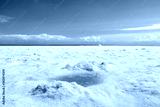 Pink water puddle on salt lake coast with white salt and blue sky. Syvash or Sivash sea spa recreation summer sunny time, the Putrid Sea or Rotten Sea, Ukraine