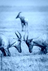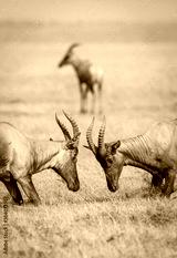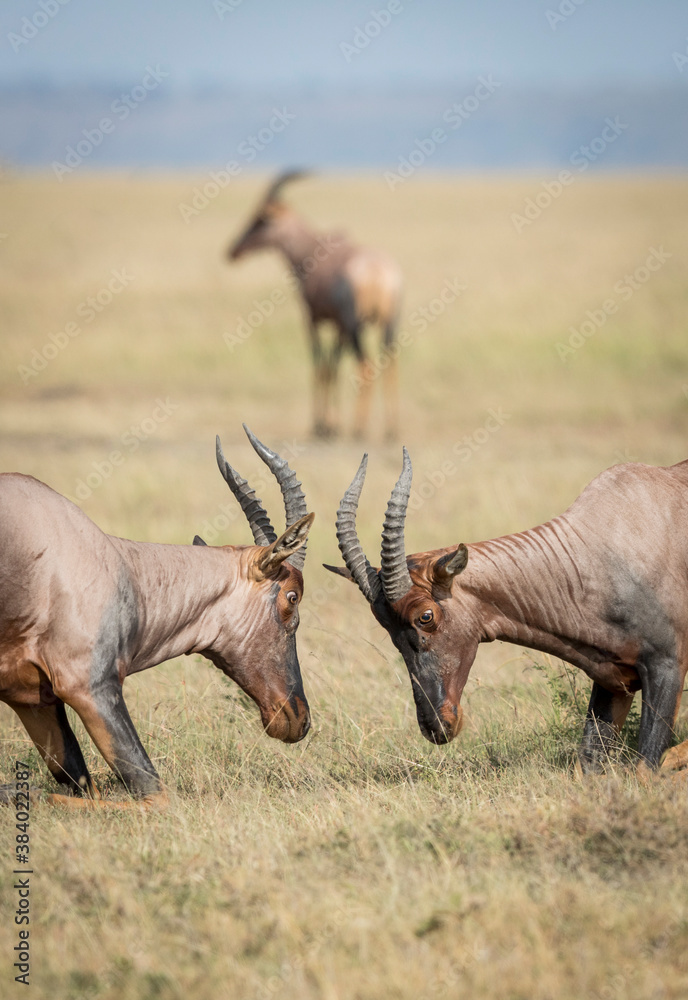 Vertical portrait of two topi antelope fighting in Masai Mara in Kenya