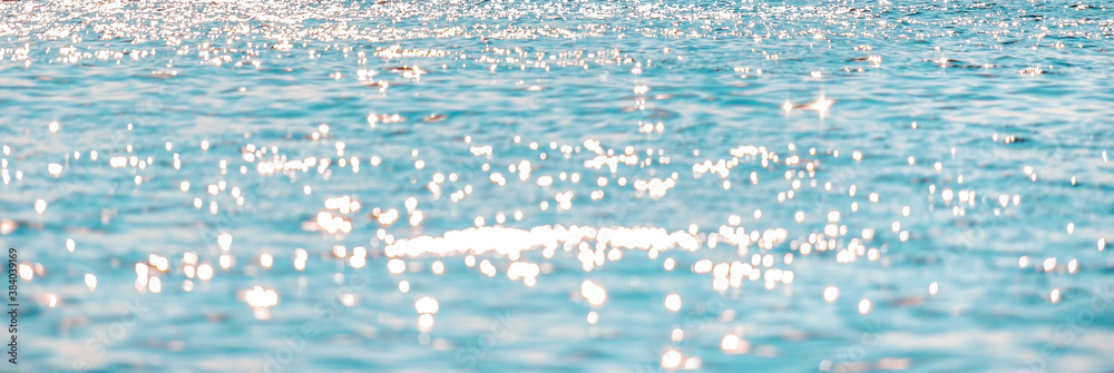 Sun light reflecting or sparkling glitter on water of sea or ocean with beautiful sky blue light tone.