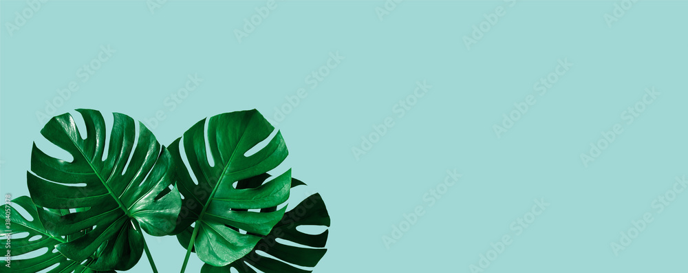 top view of tropical monstera leaf shadow on blue color background. minimal summer concept. flat lay