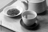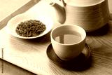 Green tea and tea leaves on a wooden tray