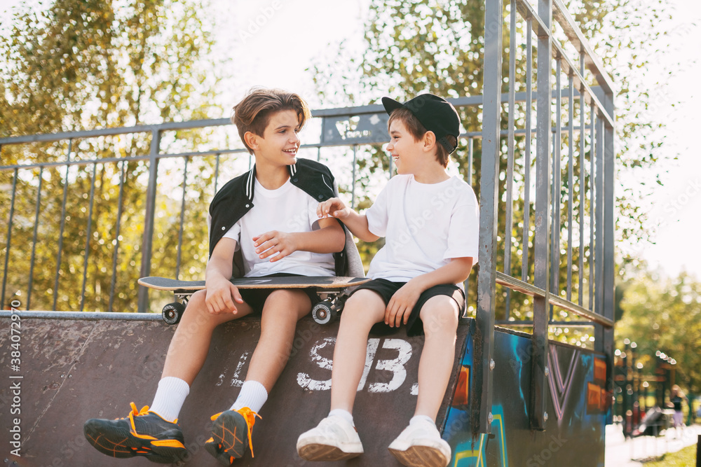 Teenagers enjoy their free time in the skate Park, sitting on the ramp. The concept of youth, unity and friendship