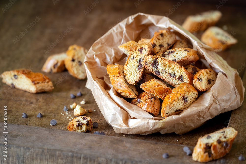 Delicious homemade cantucci biscuits or Italian biscotti with chocolate drops on dark rustic wooden table with a coffee pot and a cup at the background