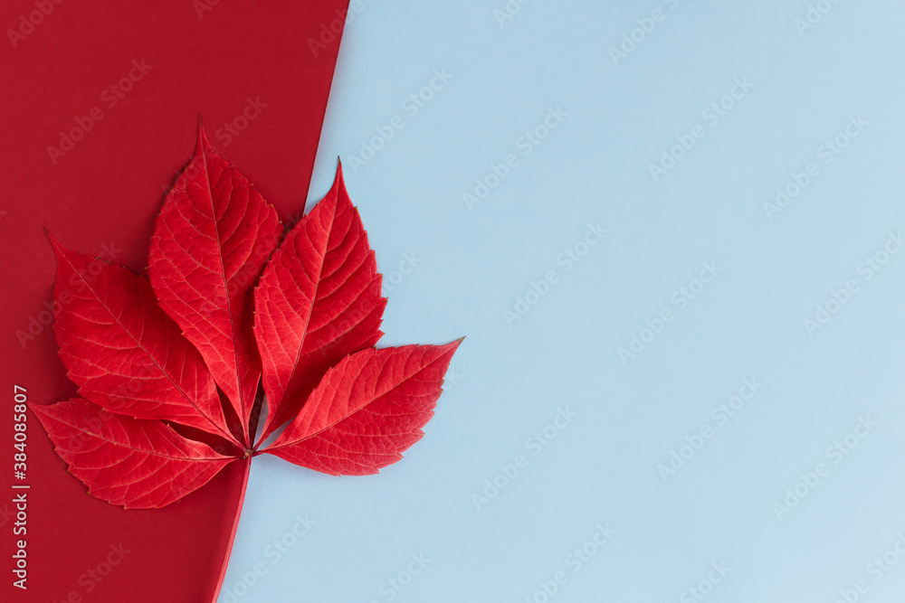 Beautiful red leaf on a light blue and red background. Autumn background.