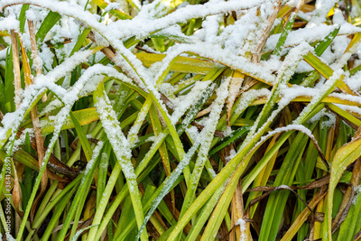 The end of autumn, the first snow on the green grass, winter is approaching.
