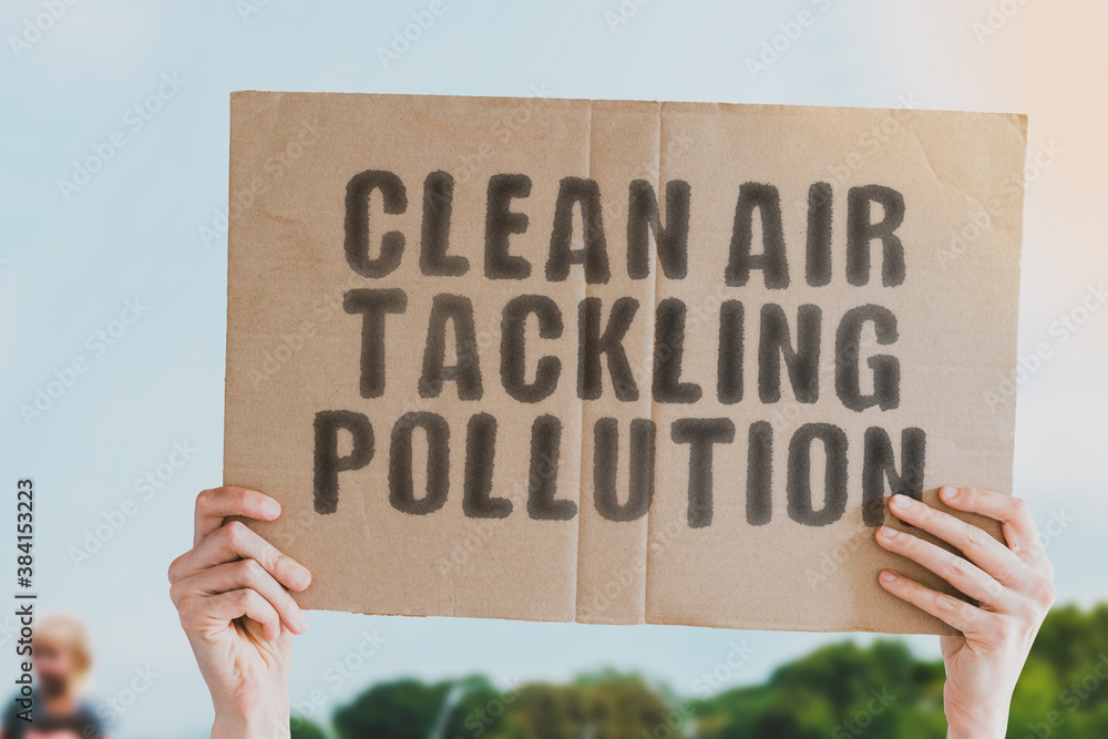 The phrase " Clean air tackling pollution " on a banner in men's hand with blurred background. Breathing. Polluted. Environment problems. Dirty. Quality