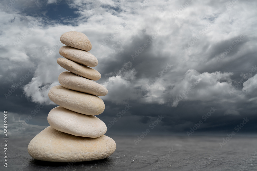 Stack of pebbles in an unstable state. A pyramid made of flat stones.
