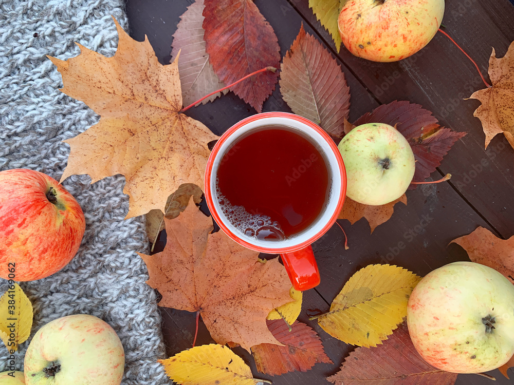 Autumn mood: cup of tea, warm blanket, yellow and red leaves, apples and book on wodden table, flat lay, top view.