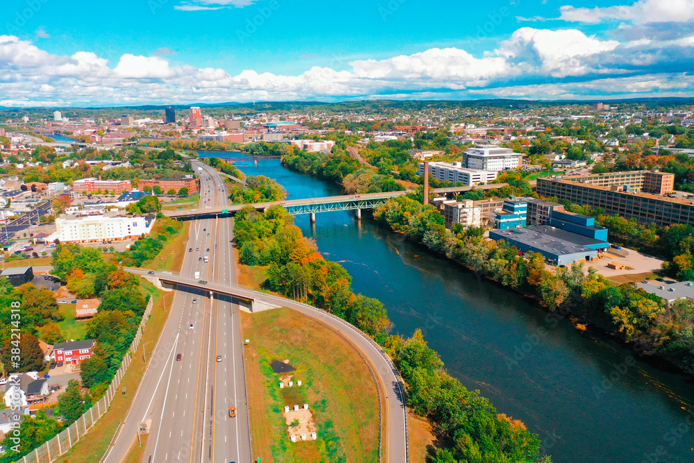 Aerial Drone Photography Of Downtown Manchester, NH (New Hampshire) During The Fall Foliage Season