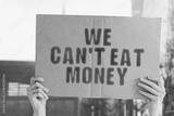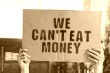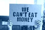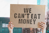 The phrase " We can't eat money " on a banner in men's hand with blurred background. Protest. Pipeline. Pollution. Polluted. Environment. Life. Food