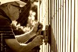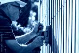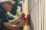 Old man sanding wood fence by sander. Senior man using work tool. Renovation of wooden picket fence at backyard