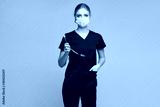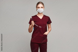 Young woman in medical uniform and medical mask posing with an endotracheal tube at the grey background, isolated. Healthcare and emergency concept