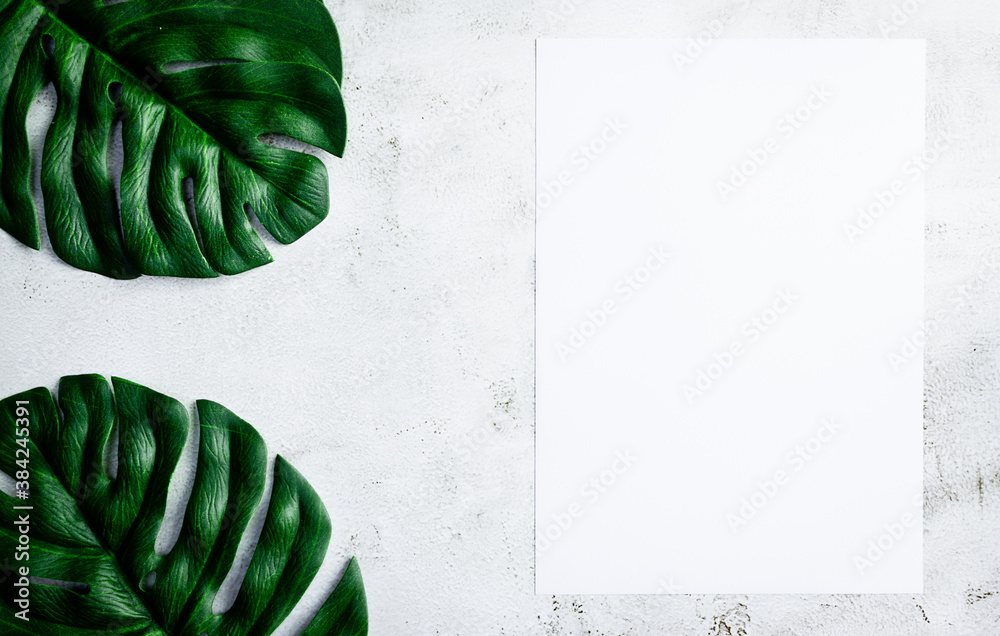 Monstera leaves and white landscape sheet in an upright position. Empty space for drawing and writing. Calmness and concentration.