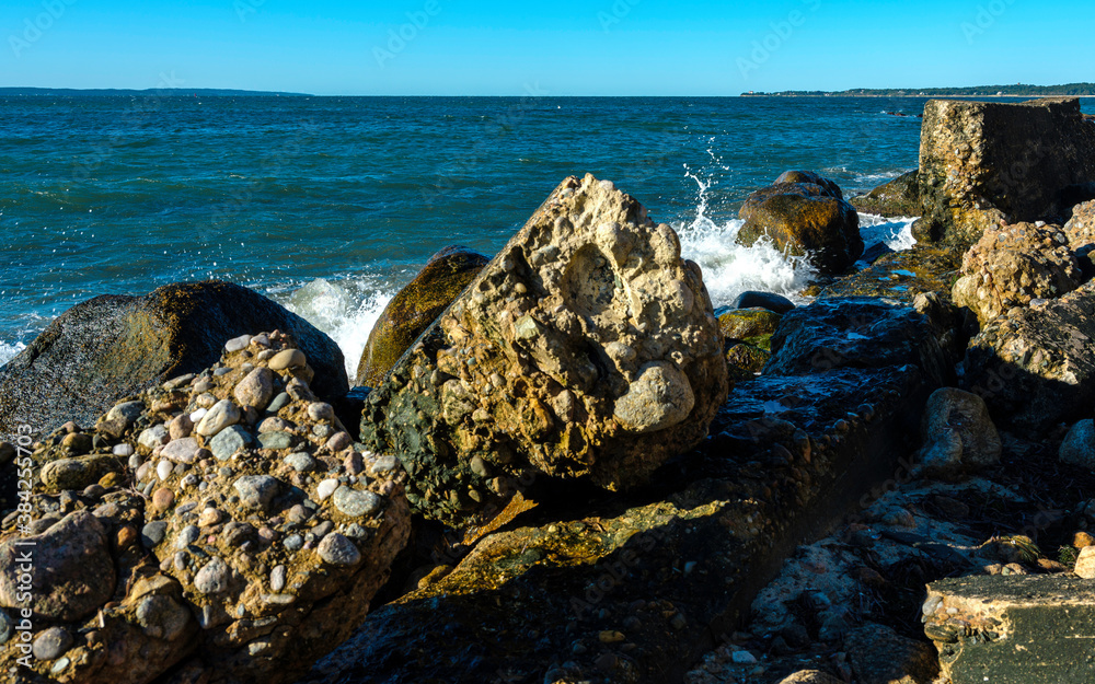 Waves Splashing over the Ruined Seawall or Breakwater in the Seashore on Cape Cod