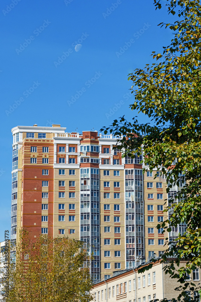 Fragment of the facade of a high-rise residential building against the blue sky