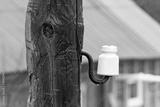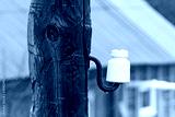 Electrical insulator fixed on a wooden pole in rainy weather close-up