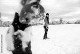 Woman is playing with her dog in the snow at the winter season, frisbee or flying disc