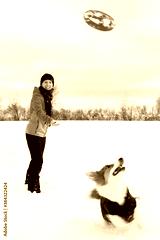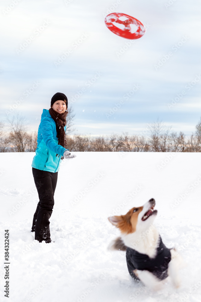 Winter walk in the snow, woman is playing flying disc or frisbee with her dog