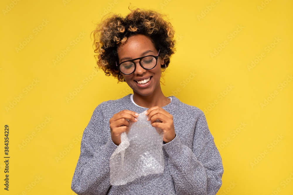 African american woman bursts bubbles on a packaging bubble wrap, trying to calm down.