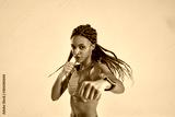 Strong and confident mixed race woman practicing boxing and looking at camera while standing isolated over grey background