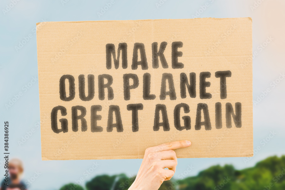 The phrase " Make the climate great again " on a banner in men's hand with blurred background. Cataclysm. Dangerous. Science. Hazardous. Pollution. Climate change. Rubbish. CO2