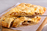 Spicy pear and raisin pie, sliced