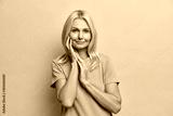 Studio shot of calm beautiful woman with healthy skin touches face gently wears minimal makeup has tender smile takes care of her complexion wears yellow t shirt in one tone with background.
