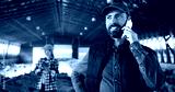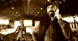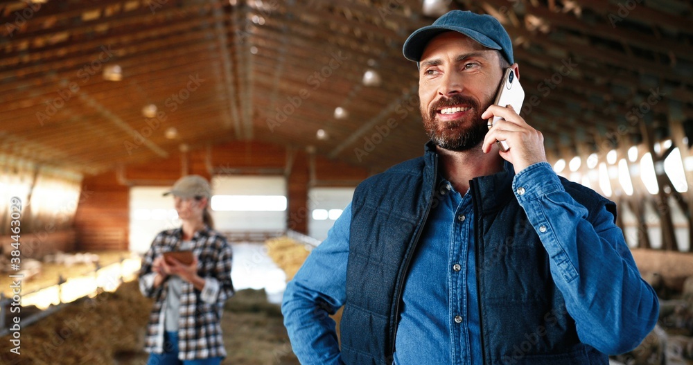 Caucasian male shepherd talking on mobile phone in barn with livestock. Smiled man speaking on cellphone while workng at farm with sheep. Telephone call conversation. Woman using tablet on background.