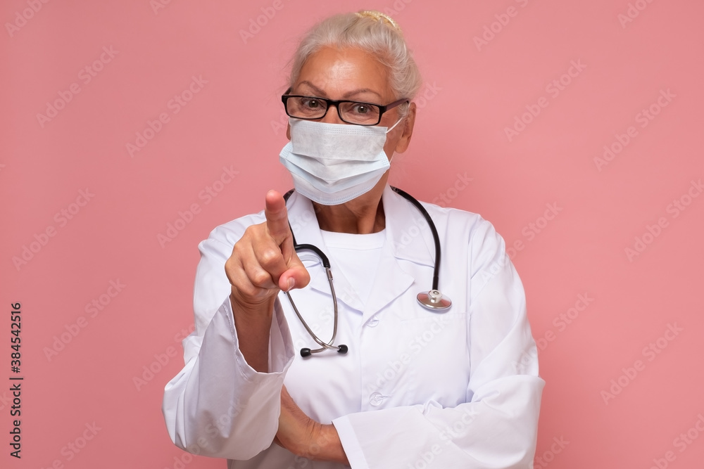 Senior woman with stethoscope wearing mask doctor pointing at you.