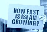 The question " How Fast Is Islam growing? " on a banner in men's hand with blurred background. Religion. Growth. Islamic. Belief. God. Impact. Popular. Expansion