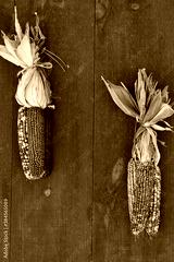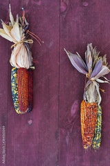 Decorative Indian corn with colorful kernels on a red barn wall in the fall