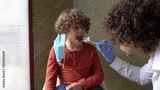 Quick test for suspected coronavirus diagnosis. Doctor taking a nasofaringeal sample of a young boy, with a cotton swab. Covid19 screening. Child