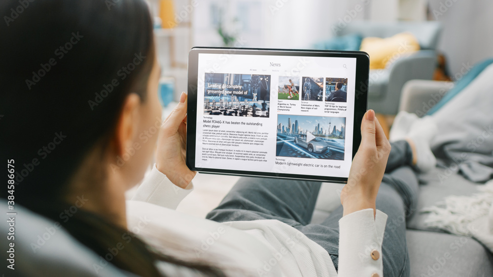 Over the Shoulder Shot of a Young Woman at Home Lying on a Couch and Using Tablet Computer in Horizontal Landscape Mode for Reading News about Technology. Girl Using Touchscreen Device.