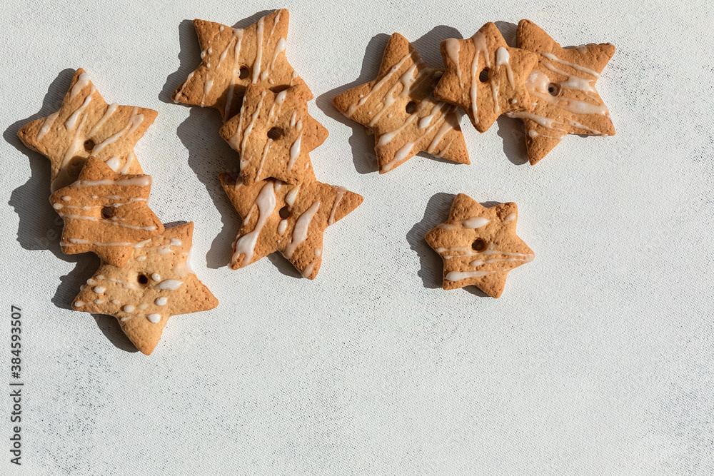 Christmas homemade shortbread cookies in the shape of a star of different sizes, on a white worn background. the view from the top. hard sunlight