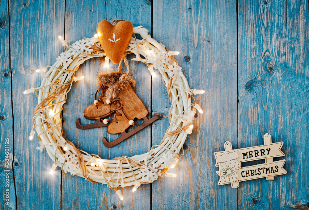 New year decorations around Christmas letter empty space for text burning lights garlands on blue wooden background.
