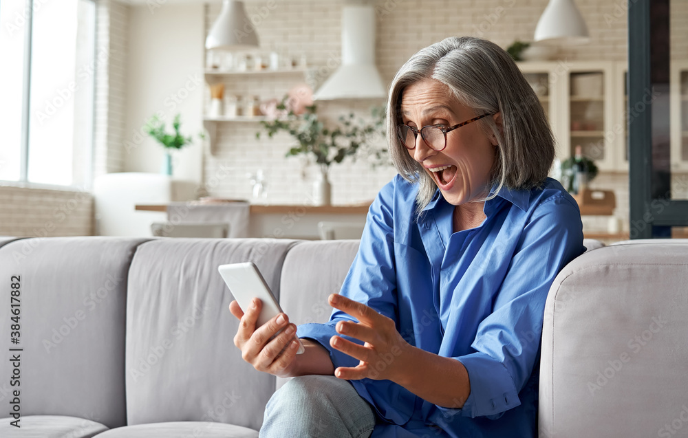 Amazed happy mature older 60s woman, excited customer holding smartphone using mobile app feeling great positive surprise reaction receiving gift reading sms on cell phone sitting on couch at home.