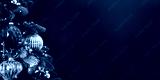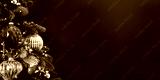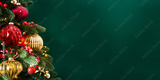 Decorated with ornaments and lights Christmas tree on green background. Merry Christmas and Happy Holidays greeting card, frame, banner. New Year. Noel