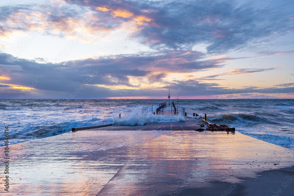Waves crushing over wooden pier at sunset with clouds reflecting in the wet surface