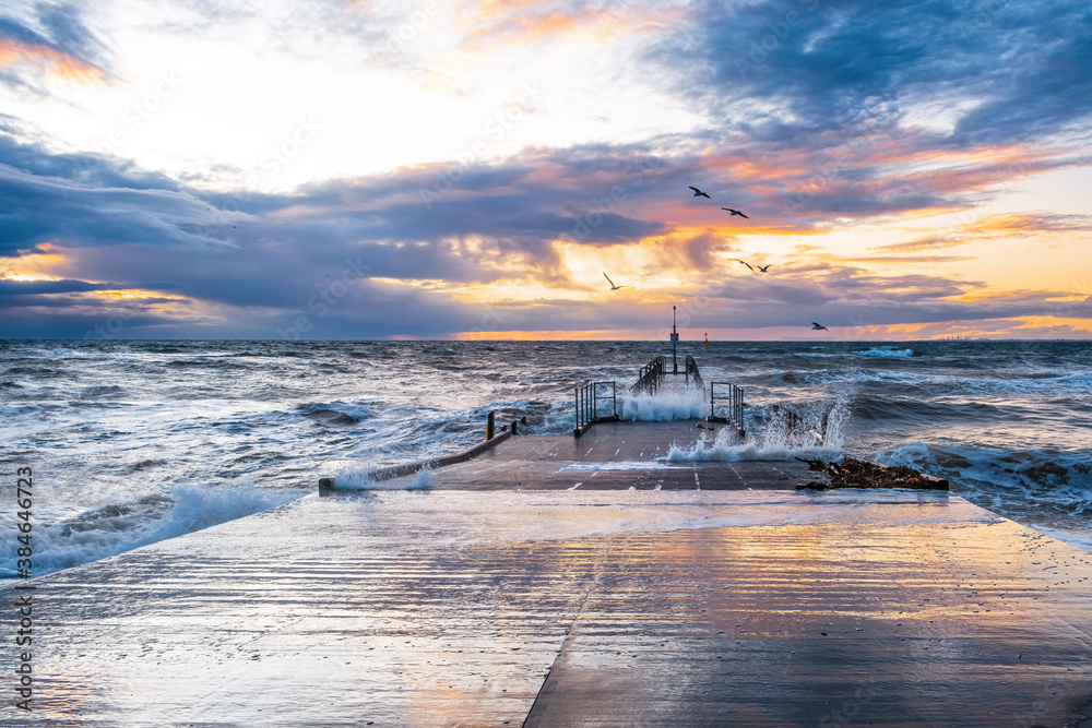 Storm waves crushing on a pier with flying seagulls at sunset in Melbourne, Australia