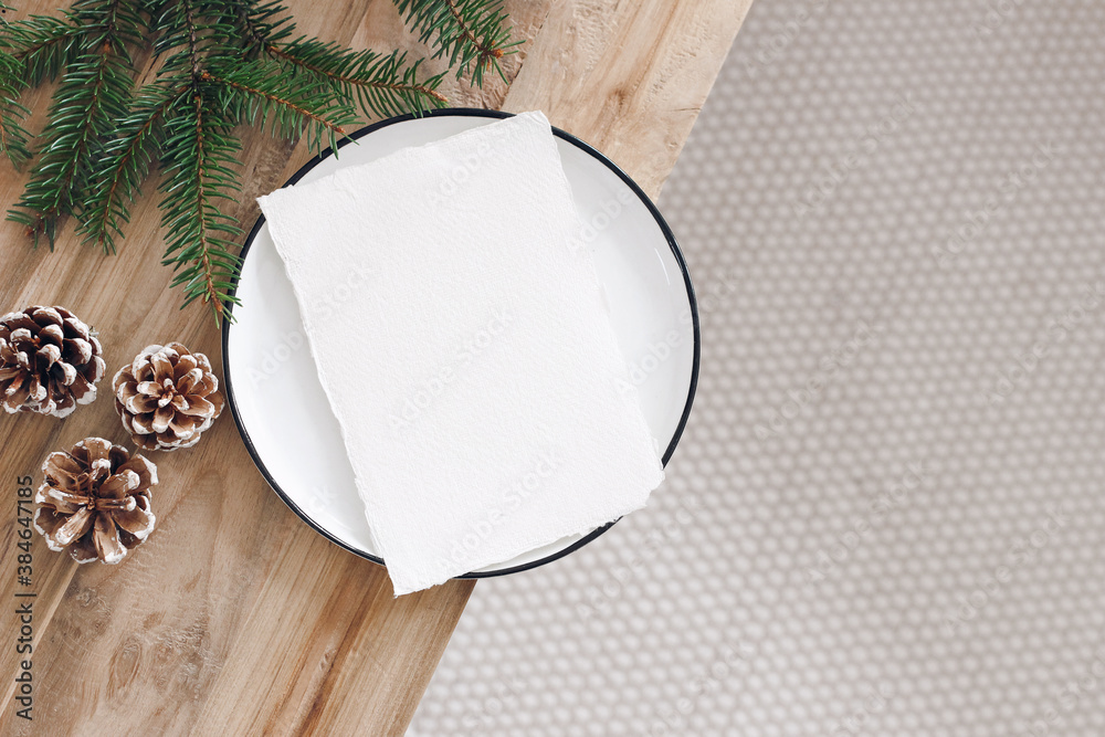 Christmas festive still life. Blank paper sheet, greeting card mockup on white plate. Old wooden bench with pine cones and spruce branches.Blurred white carpet background Flat lay, top view.