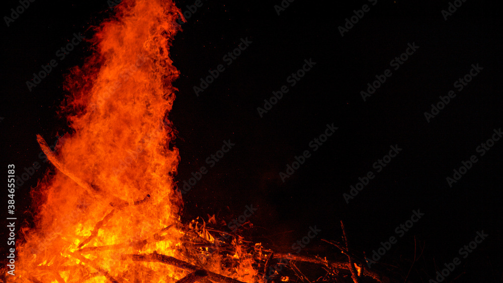 COPY SPACE: Beautiful shot of massive campfire rising into dark summer night sky
