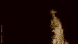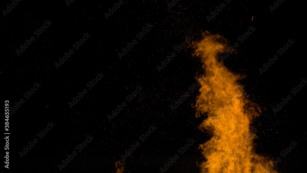 CLOSE UP: A large blaze bursts high into the dark night sky near a wildfire.