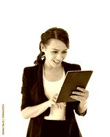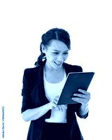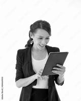 Southeast Asian young office business woman wearing suit holding reading using tablet tab on white studio background