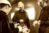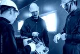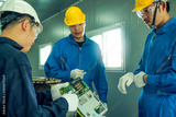 Professional engineering walking discuss inspecting with engineer team machinery factory area. Manager hand use tablet listenreport paper for internal audit. Quality assurance for manufacturing.