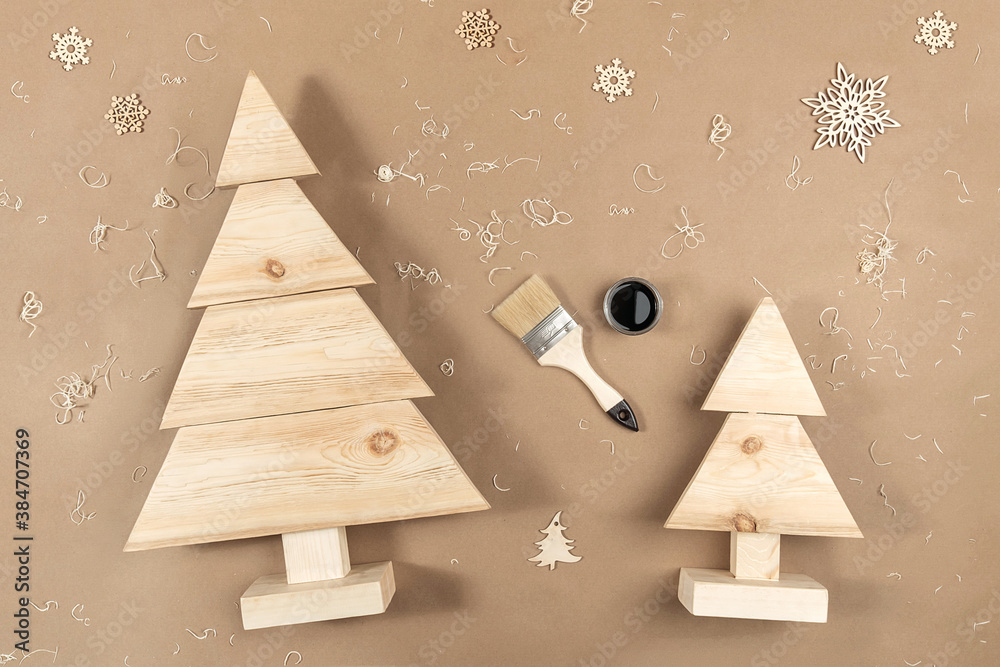 XMAS or New Year composition. Handmade wooden Christmas trees, paint, brushes on craft beige background. Concept Zero waste, eco - friendly Merry Christmas. Top view Flat lay