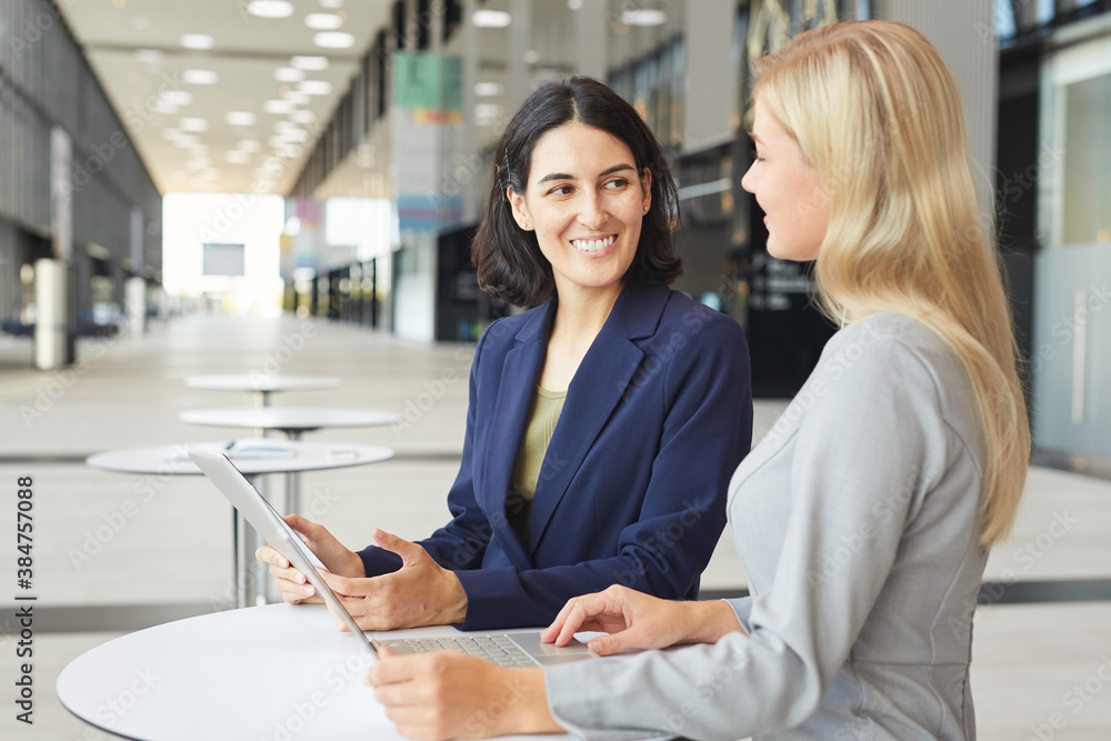 Waist up portrait of successful businesswoman discussing work with female partner while standing at desk in office building, copy space